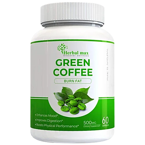 Herbal Max Green Coffee Bean Extract Capsules are a natural weight management supplement designed to support fat metabolism, energy balance, and antioxidant protection. Each capsule contains pure green coffee bean extract standardized for Chlorogenic Acid (CGA) — the key active compound that helps regulate blood sugar levels and promote healthy weight loss when combined with a balanced diet and regular exercise.