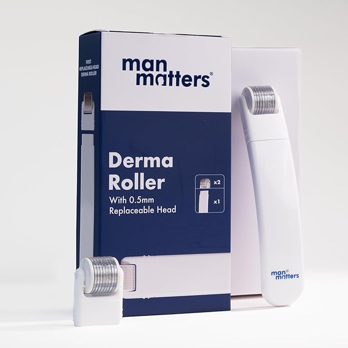 Man Matters Derma Roller with Replaceable Head is a premium-quality microneedling tool designed to stimulate hair follicles, promote beard and scalp growth, and reduce hair fall — now made smarter with an interchangeable head system for improved hygiene and convenience. Featuring 540 titanium alloy micro-needles (0.5mm), it enhances blood circulation, boosts collagen production, and improves the absorption of hair and beard growth serums.