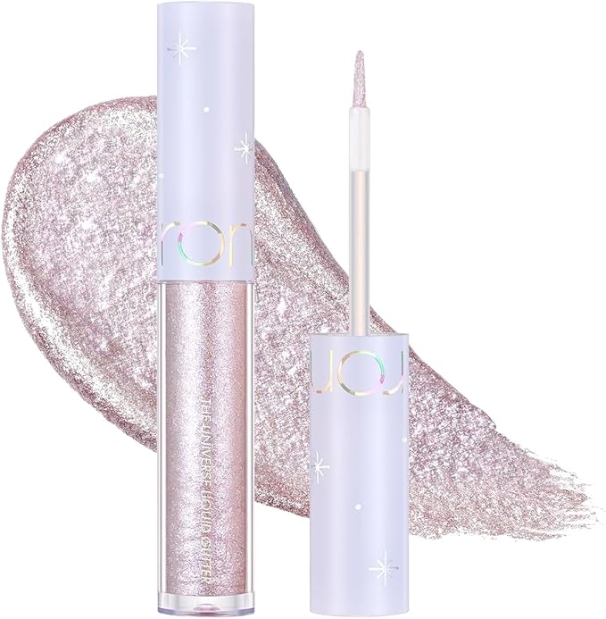 Rom&Nd The Universe Liquid Glitter in shade 07 Mystic Moon is a liquid glitter eyeshadow that adds a soft lavender-silver sparkle to your eyes. The lightweight gel base makes it easy to apply, giving your eyelids a radiant, shimmery glow that catches the light beautifully.