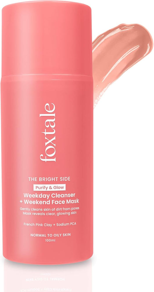 Foxtale Purify & Glow Cleanser + Mask is a 2-in-1 detoxifying and brightening formula that works both as a daily gentle cleanser and a purifying face mask. Infused with French Pink Clay and Sodium PCA, it helps draw out impurities, control excess oil, and refine pores without drying out your skin. The soothing, mineral-rich pink clay detoxifies while maintaining hydration, leaving your skin fresh, soft, and naturally radiant after every use.
