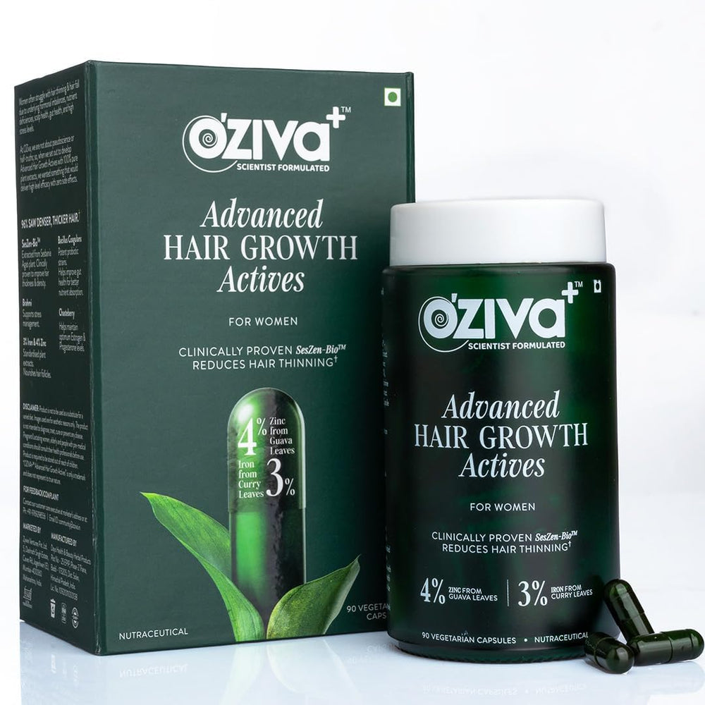The Oziva+ Advanced Hair Growth Actives (90 Capsules) are a clinically researched, plant-based supplement formulated to help reduce hair thinning, improve scalp coverage, and strengthen hair from the roots. Infused with pure, bioactive plant ingredients, these capsules work at the cellular level to support follicle growth, nourish the scalp, and enhance hair density — all without any side effects or harmful chemicals.