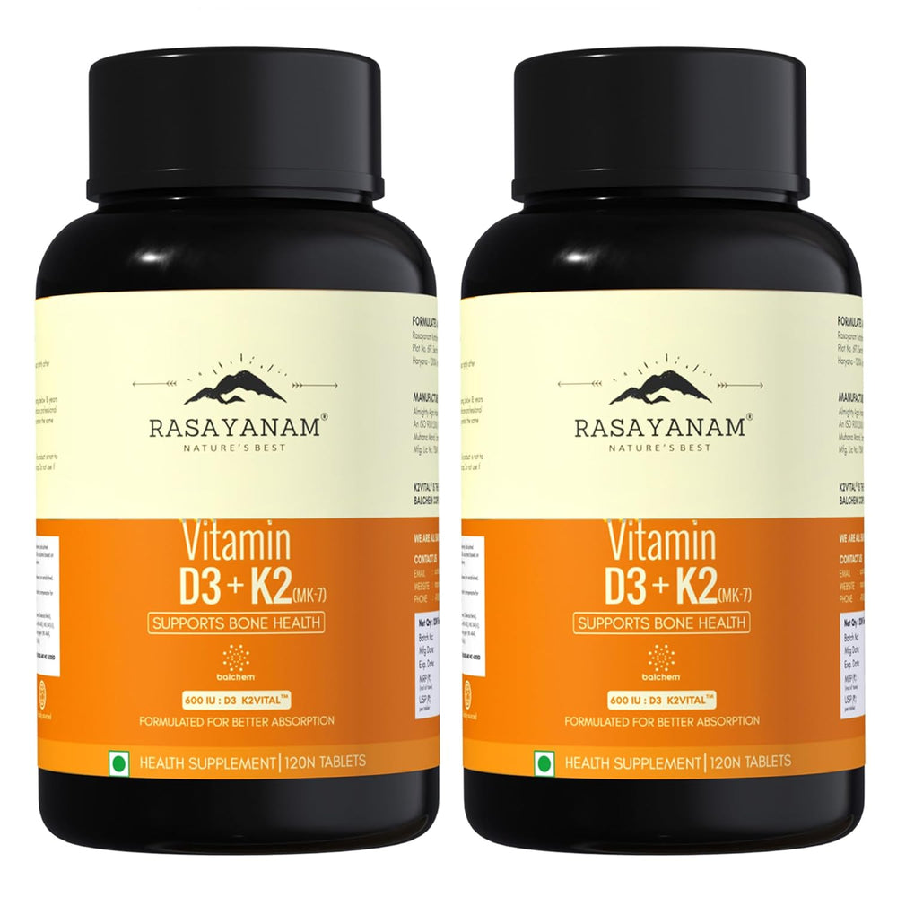 Rasayanam Vitamin D3 K2 (MK-7) combines the essential nutrients Vitamin D3 and Vitamin K2 in a convenient vegetarian tablet form to support bone health, immune function, and cardiovascular wellness. With 240 tablets per pack, this supplement is designed for long-term daily use, helping maintain healthy bones, teeth, and overall vitality.