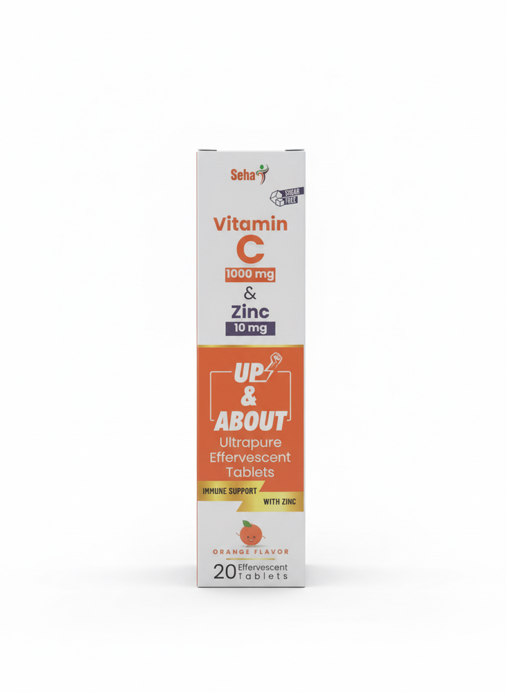 SEHA UP & ABOUT Vitamin C + Zinc is a daily immunity support supplement formulated to help strengthen the body’s natural defenses, support overall wellness, and promote faster recovery from everyday stressors. Each tablet delivers a high-strength dose of Vitamin C (1000 mg) combined with Zinc (10 mg)—two essential nutrients known for their role in immune function and antioxidant protection.
